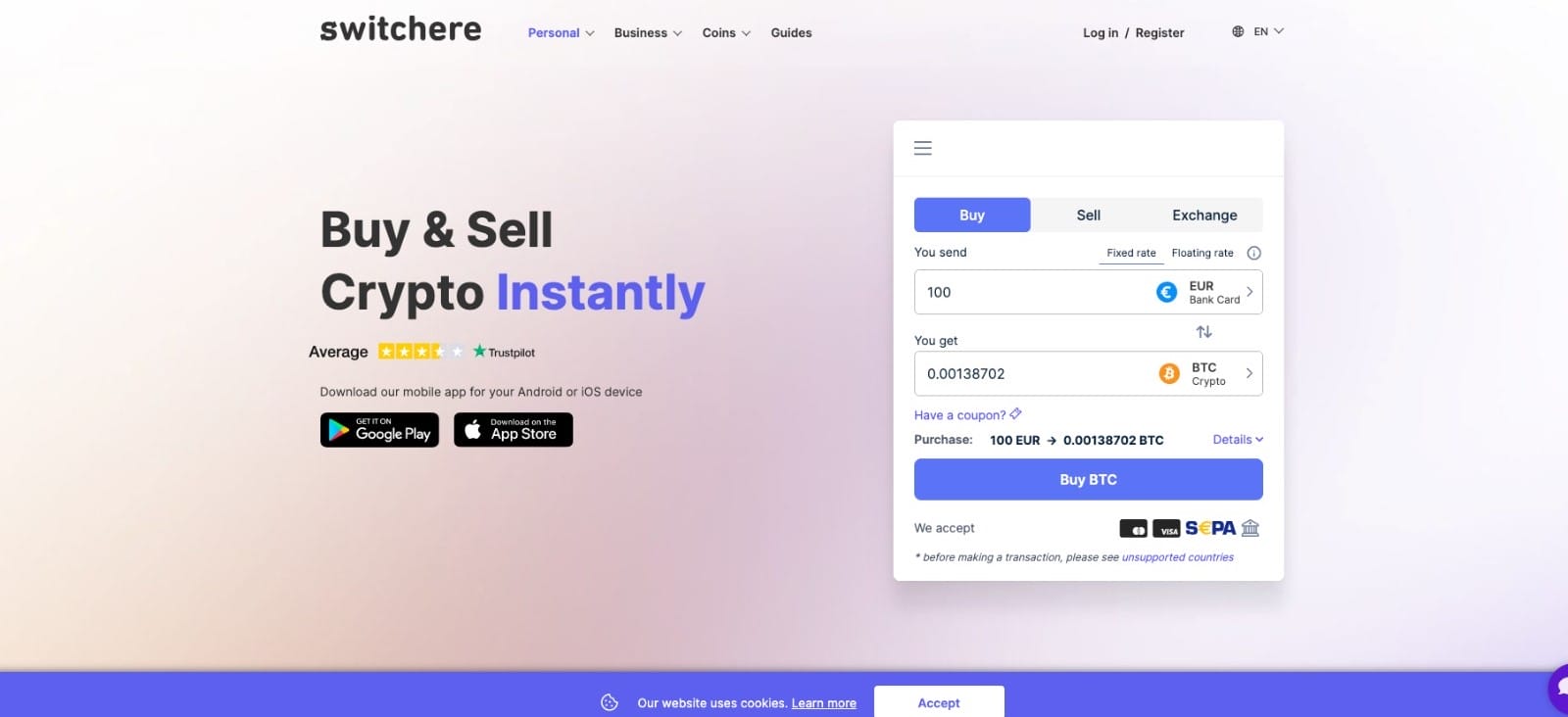 雖然Switchere在英國尚未上線,但它在160多個國家擁有許可證。用戶可以透過信用卡或金融卡、SEPA轉帳、SOFORT或銀行轉帳購買加密貨幣。