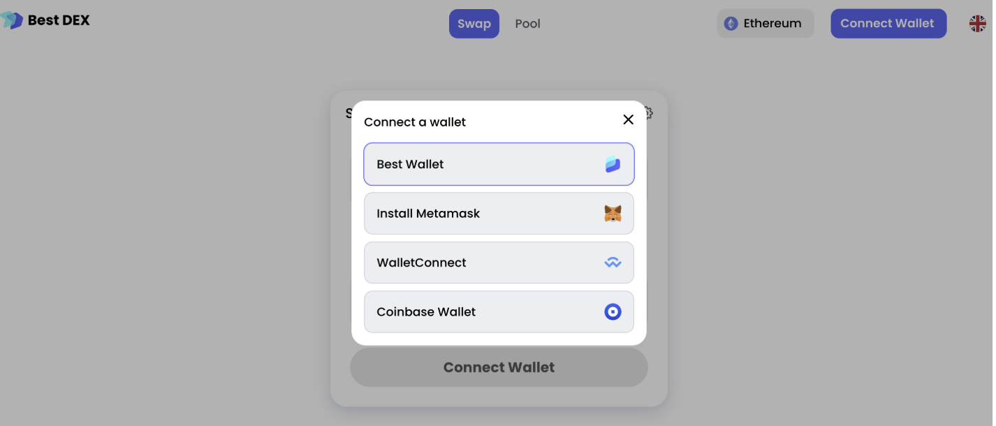 Best Wallet是一款支援iOS和Android行動裝置的行動應用,也可以透過標準的網頁瀏覽器存取。交易流程非常簡單 – 首先,您需要將一些加密代幣存入Best Wallet。或者,您可以將自己的錢包連接到Best DEX – 選項包括MetaMask、Coinbase Wallet和WalletConnect。