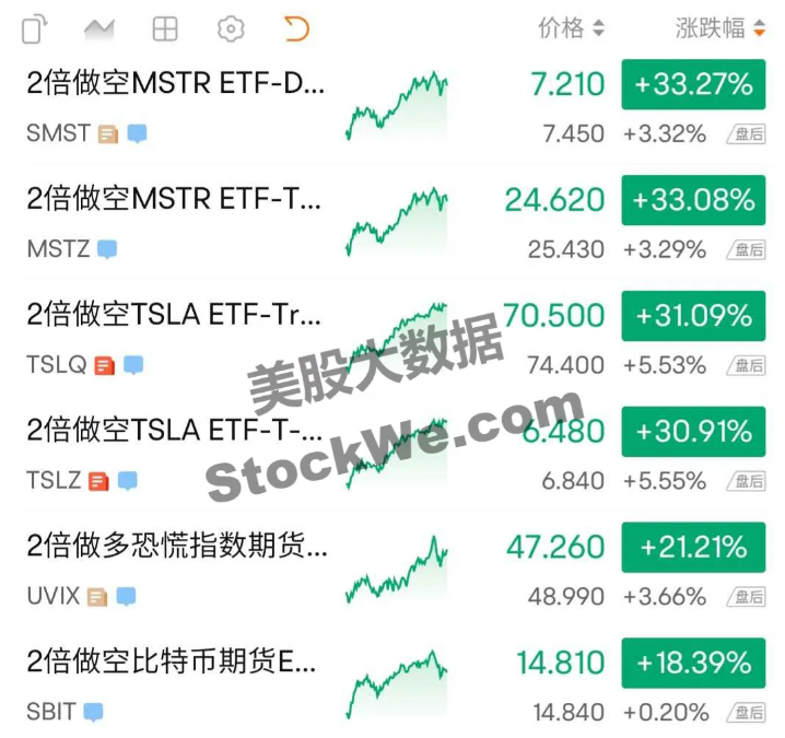 多隻槓桿與反向ETF大幅上漲。2倍做空MicroStrategy ETF(SMST、MSTZ)漲超33%,2倍做空特斯拉ETF(TSLQ、TSLZ)漲超30%,做多恐慌指數ETF(UVIX)上漲21%,做空比特幣期貨ETF(SBIT)漲超18%,1.5倍做多短期期貨VIX(UVXY)漲超16%,做空科技股ETF(FNGD)和3倍做空半導體ETF(SOXS)均錄得兩位數漲幅。這表明市場避險情緒正在迅速升溫,資金加速湧入風險避險工具。