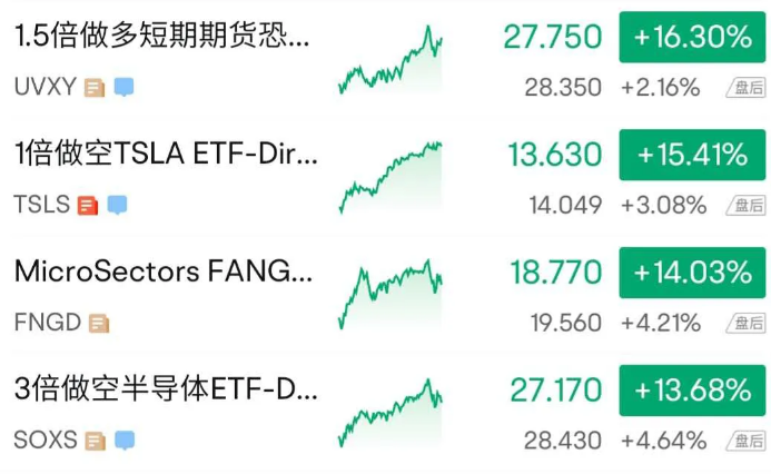 今天市場整體承壓,但並不是所有資產都遭遇拋售,一些防禦性類股和槓桿反向ETF逆勢上漲,說明資金正在尋求避險。