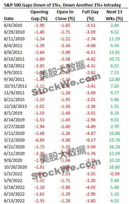 根據美股巨量資料 Stockwe.com 回顧歷史資料,雖然短期市場情緒低迷,但過去的資料告訴我們,每次恐慌性下跌3%之後,標普500往往都會有一波不錯的反彈。