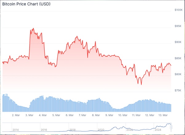 比特幣重返六位元數價格的路徑並非一帆風順。本月早些時候,比特幣曾短暫觸及 78,000 美元,但隨後市場的不確定性增加。比特幣儲備購買計畫的時間安排仍不明確,同時美國前總統唐納德·特朗普的關稅政策引發擔憂,這些因素加劇了市場的恐懼、不確定性和懷疑(FUD)。