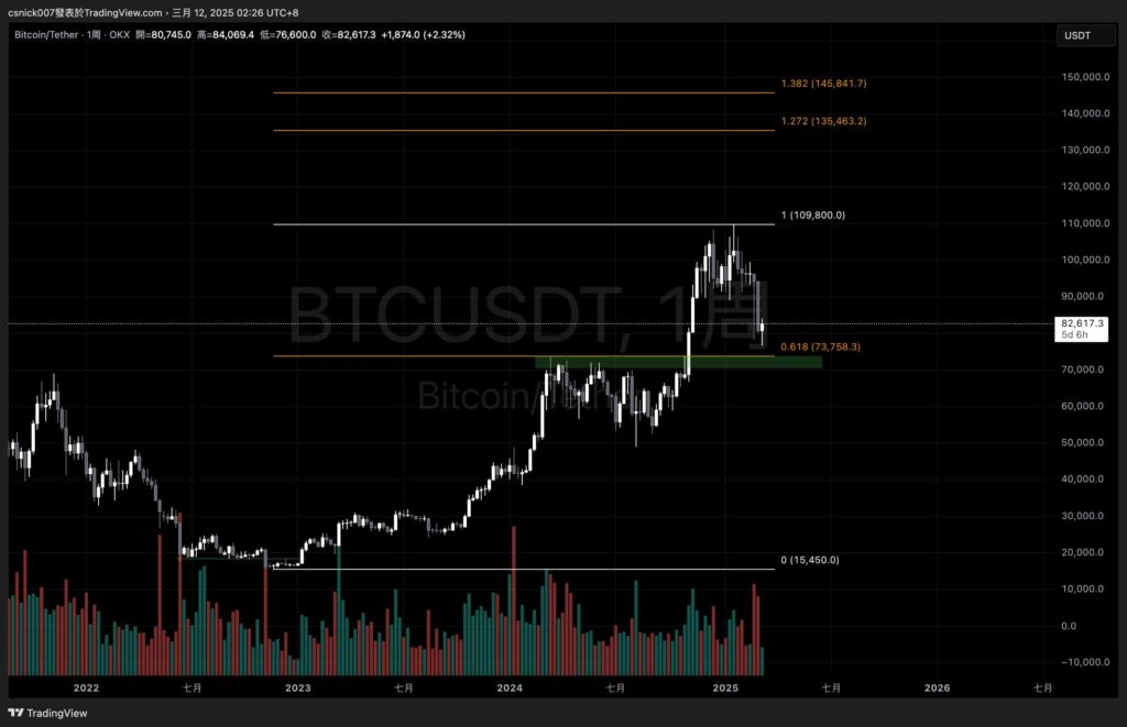 以技術分析的範疇看待比特幣最優的潛在抄底區,去年所形成出的 73,000 日線壓力水平將會是非常值得參考的切入位置,以過往經驗來看日線支撐區間重合斐波那契回撤 0.618,都具備著高效力的支撐效果,而這也意味著比特幣有一定程度的機會再次下探測試 73,000 支撐。