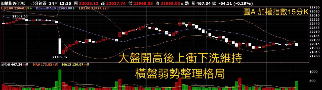 接下來我們可以看一下上圖(A)的加權指數15分K,大盤今日跳空開高後遭受賣壓拉回,盤中維持上沖下洗的狹幅震盪整理,多方的表現還是相對疲弱,短線維持空方趨勢不變,最終指數上漲6點作收。