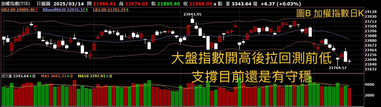 最後我們看一下上圖(B)的加權指數日線圖,大盤今日開高震盪走高,雖然早盤逆勢跳空開高,不過上檔的壓力還是非常沉重,盤中回測低點還是有強勁的支撐,目前上有壓、下有撐,如果後續有出現反彈持續還是維持偏空操作。