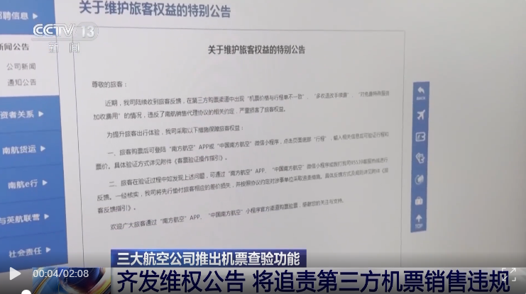 針對機票銷售中的資訊不對稱,此次三大航空公司均推出了機票驗真和票價稅費查詢功能,旅客可以在其小程序或App進行機票驗真,一旦發現問題,便可向航空公司反饋。