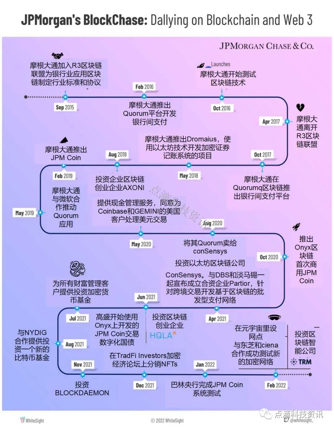 對於這家銀行業巨頭來說, 2022 年似乎已經開始了相當積極的發展。巴林中央銀行使用Onyx 完成了對JPM Coin 的測試,允許Bank ABC在美國為巴林鋁業(ALBA)推出實時支付。更重要的是,這家銀行業巨頭還通過在Decentraland推出Onyx 休息室進軍虛擬世界,並附上一篇解釋企業如何在虛擬世界中找到新機會的論文。摩根大通、東芝和Ciena加入平台,認識到區塊鍊網絡面臨的安全威脅,成功測試了可用於保護區塊鏈通信的新加密網絡,同時還投資了區塊鏈情報公司TRM Labs。這進一步表明,儘管加密貨幣最初受到摩根大通領導層的懷疑和蔑視,但這並沒有阻止公司擁抱其背後的技術並根據市場需求不斷發展;隨著該機構一次又一次地擁抱區塊鏈、加密貨幣和其他web 3 趨勢,推動了銀行業的持續發展。