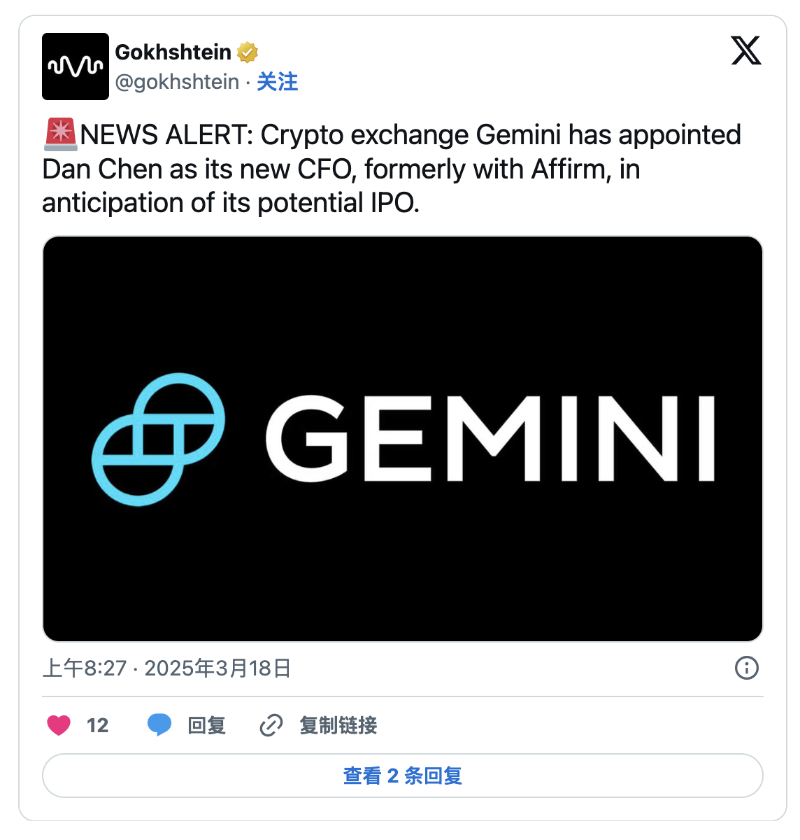 加密交易所 Gemini 任命前 Affirm 高管 Dan Chen 為新任 財務長(CFO),暗示公司可能籌備首次公開發行(IPO)。 Chen 稱 比特幣是金融領域最具活力的賽道,凸顯機構興趣持續升溫。