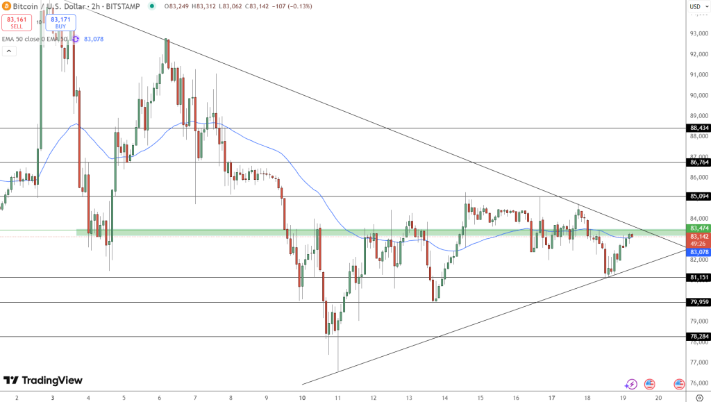 比特幣目前在 $83,180 附近震盪整理,2 小時圖上形成對稱三角形形態,預示關鍵時刻即將到來,交易者正等待突破方向指引下一步走勢。