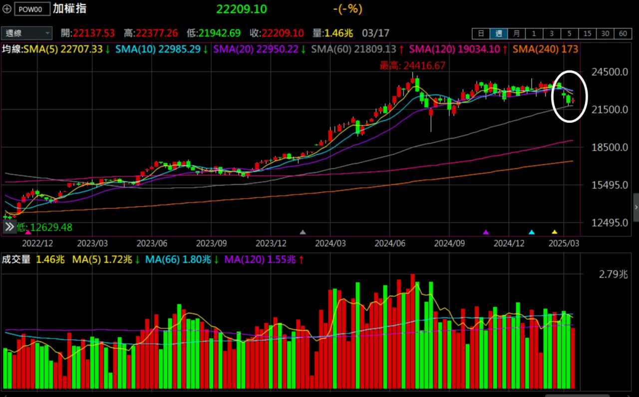 周5下跌主要因為台灣被川普政府列入對美徵收高額關稅的骯髒15國,市場憂心貿易摩擦升級,所以整個市場都處於一種恐慌情緒中,權值股未能延續周4的上漲動能,拖累指數的走勢,整體市場還是非常保守,終場收盤指數下跌168.16點,失守年線,但也有守住5、10日均線。