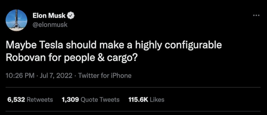 Elon Musk 在週末發了一則推特,內文為「或許特斯拉應該要打造一輛可提供貨物與人們高度運用的 Robovan?」(Maybe Tesla should make a highly configurable Robovan for people & cargo?),此舉暗示 Tesla 未來會有電動貨車推出的可能性。