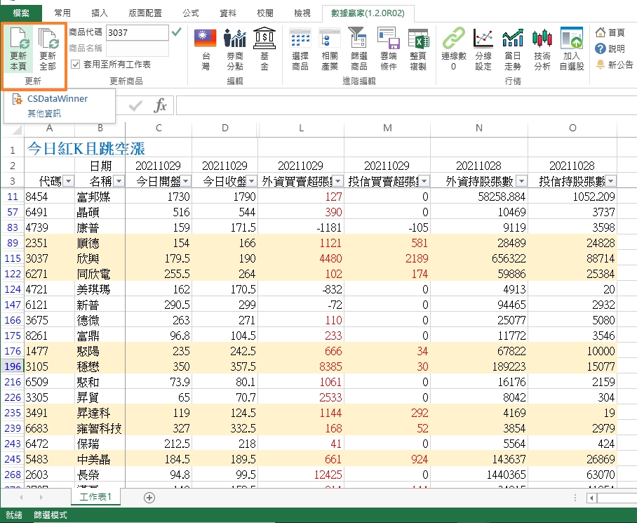 今天又用 #數據贏家 拉了一個【今天是紅K棒且跳空漲的股票】,同時看外資與投信今天的買賣超