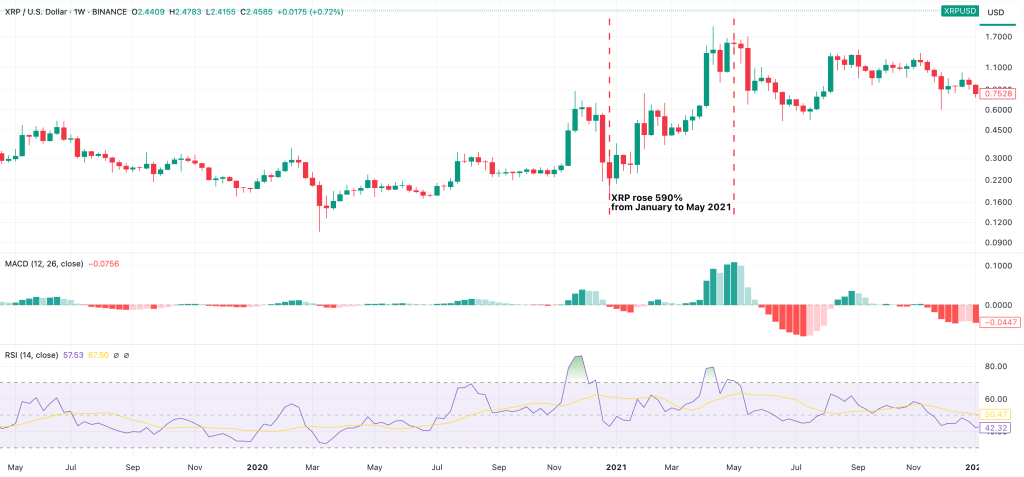 儘管這項指標通常被視為看跌訊號,但 XRP 在 2021 年的走勢卻顯示了相反的情況。從 2021 年 1 月到 2021 年 5 月,XRP 價格上漲了 590%。