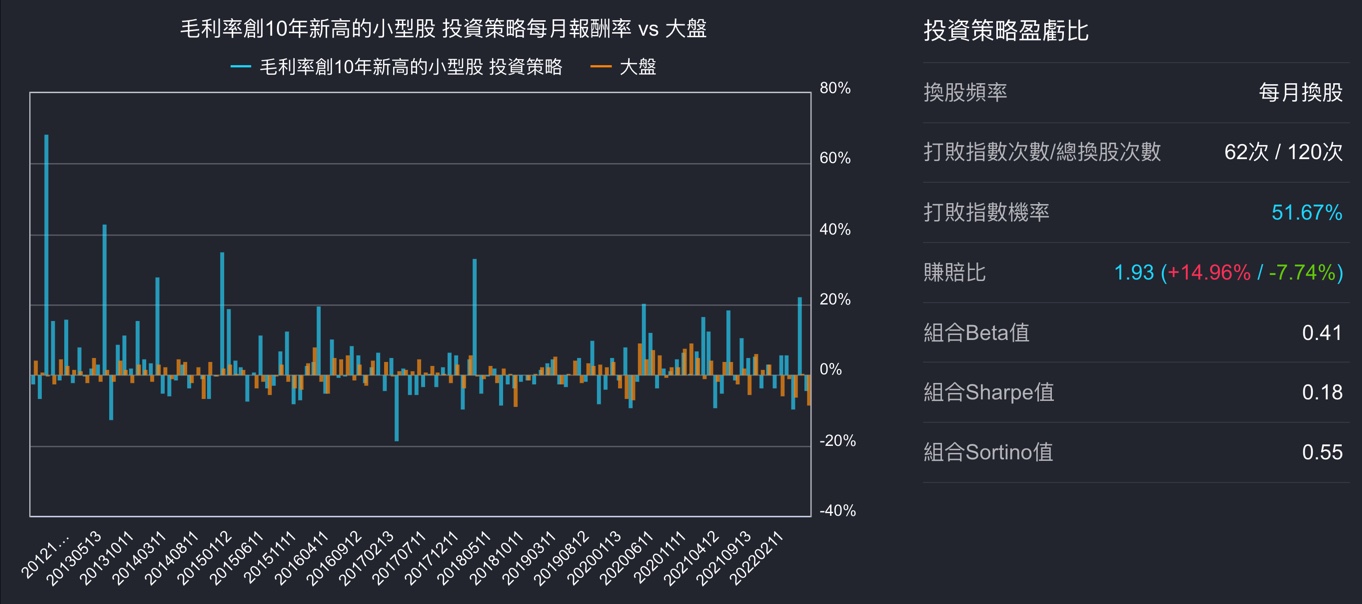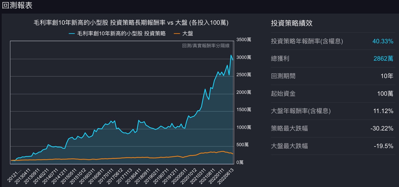 毛利率是評估一家公司產品競爭力的重要指標,毛利率高的公司,通常代表企業在市場競爭力較高,我們在做投資上選擇此類型的股票,也相對安全許多,這次要分享的投資策略為毛利率創10年新高的小型股,一起來看看此策略的回測投資績效吧!