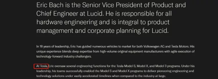 Lucid創始人之一謝家鵬 (Bernard Tse),此前曾是特斯拉前副總裁兼董事。 而之後,Lucid繼續從特斯拉"挖人",公司約有半數工程師來自特斯拉。