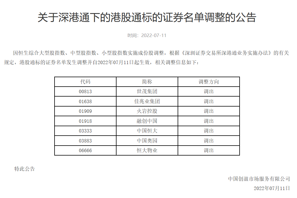 因持續停牌,7月11日,中國恆大、融創中國、世茂集團、佳兆業集團、中國奧園等5只地產股,及恆大物業、奧園健康、彩生活等3只物業股被正式剔除出恆生綜合指數。