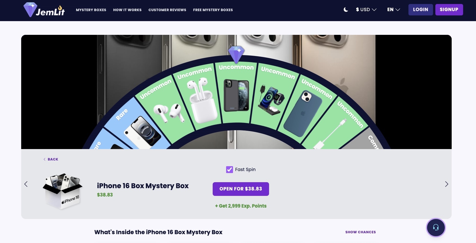 在這波潮流中,JemLit 無疑是最受矚目平台之一。這個被譽為2025年「最佳神秘盒子」網站數位平台,讓用戶能以約30美元價格,參與抽取iPhone 16、MacBook、Apple Watch等高價商品即時開盒體驗。