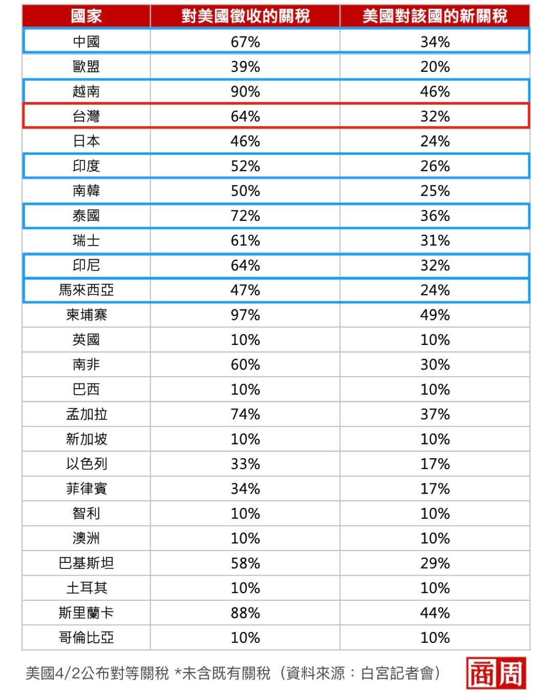 對主要貿易夥伴中國課34%、歐盟20%、越南46%、台灣32%、日本24%等,4月9日開徵