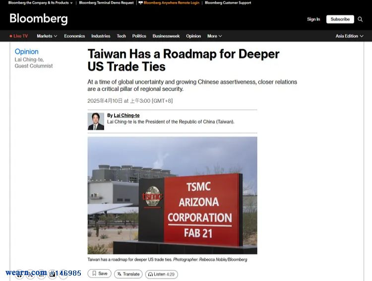 賴清德投書《彭博社》: 向全球讀者闡明台灣對於台美貿易的戰略思考,以及未來將透過對話努力排除雙方貿易障礙、增加台美投資,並將關稅化解為零😳