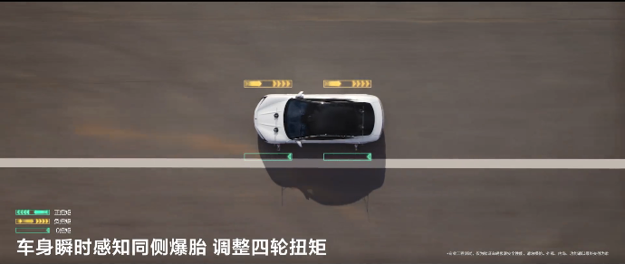 單看雲輦-Z,它的主要用途確實是為了提高舒適性,但如果把雲輦-Z和易四方四輪獨立扭矩向量控制技術、雙向20°智能後輪轉向功能三者融會貫通,就能提供同級所不具備的超強安全防禦——在高速雙輪爆胎測試中,仰望U7在160km/h+的時速下,無論同側雙輪還是對角雙輪,在車輪失壓瞬間,車輛的行進姿態和方向都未受明顯影響;而在100km/h的側向追尾測試中,仰望U7也能在短時間內迅速回歸原有行駛軌跡,實現穩行不偏移。