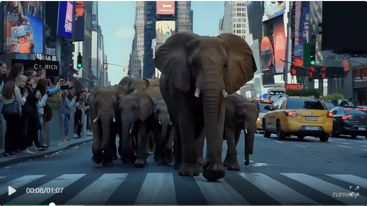 《New York is a Zoo》:集中體現了 Gen-4 驚人的視覺特效(VFX)潛力。製作團隊先通過 Gen-4 的 References 功能,將真實的動物參考圖和紐約實景照片融合,再結合提示詞指定具體動作,最終效果是將超寫實的動物無縫置入了紐約的電影感場景中