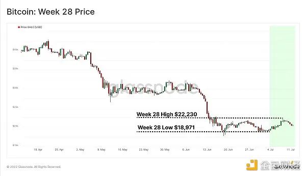 隨著市場消化了6月份的極端下行波動,比特幣價格本周繼續在2萬美元左右的範圍內盤整。交易價格走高,以18,971美元的周低點開盤,並在22,230美元處達到峰值。