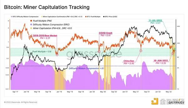 為了追踪礦工投降是否在起作用,我們可以參考一個兩部分模型,該模型尋求隱性收入壓力(皮勒乘數)和觀察到的哈希率下降(難度壓縮帶)之間的交匯處。