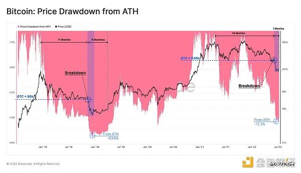 就市場結構而言,當前的熊市與2018年末有許多相似之處,我們可以從ATH(歷史最高價)指標的下降看到這一點。下面將當前2022年的熊市與2018年的熊市進行比較: