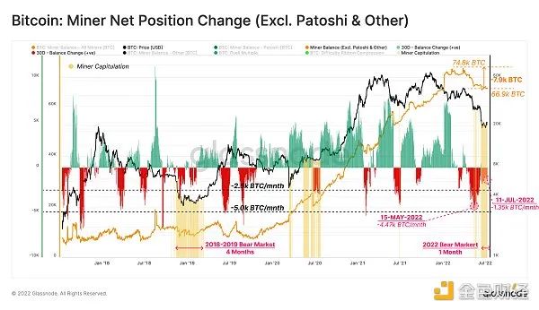 最後,我們把注意力轉向礦工群體,在熊市後期,他們往往會成為一個有影響力的拋售壓力來源。這是他們收入周期性的結果,目前的熊市也不例外。