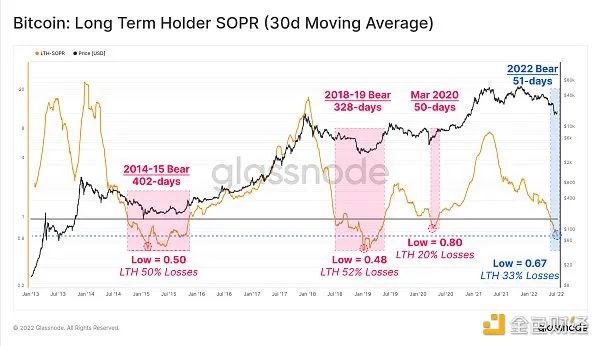 長期持有者支出產出利潤率(LTH-SOPR)是一個指標,表示LTH獲得的利潤率(即值為2.0意味著LTH以2倍成本基礎的價格支出代幣)。因此,當LTH-SOPR小於1時,這些玩家會以低於成本基礎的價格實現損失或支出代幣。
