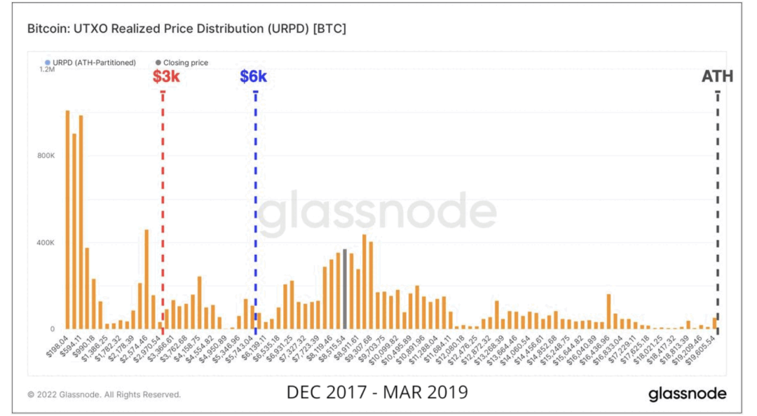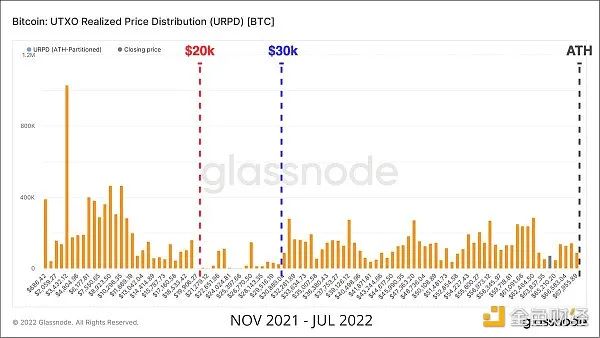 當前的2022年市場,與2021年11月ATH之後的結構類似。我們可以看到,類似的重新分配模式出現在最初於2021年5月至7月建立的3萬美元底價附近。在今年5月至6月期間,可以看到價格跌至2萬美元區域,這成為投資者投降和新買家的重要觸發點,從而成為代幣轉手的一個節點。