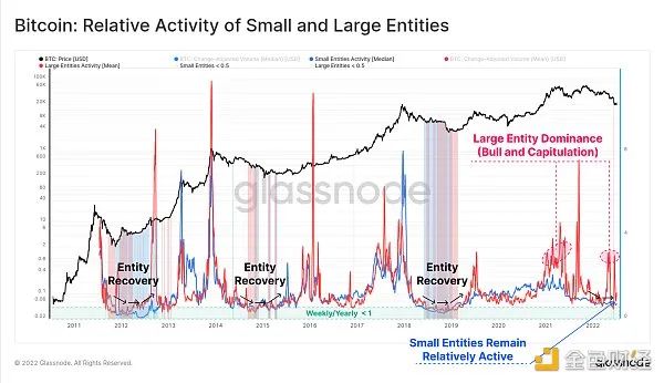 虧損供應量現已達到44.7%,其中大部分由長期持有者群體承擔。然而,與之前的熊市週期相比,這仍然是一個不太嚴重的水平。我們還引入了一個新的指標,跟踪小型和大型實體的活動水平,作為映射市場復甦的工具。這支持了我們觀察的結論,當前市場已進入熊市,但尚未形成自信底部,並且仍有事情要做。
