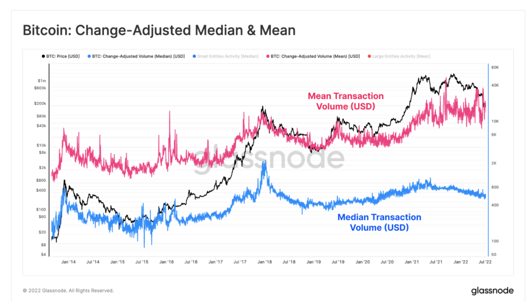 就比特幣的歷史交易數據而言,每日轉賬量的平均值通常大於中值。這在很大程度上是小額交易數量較多而大額交易數量較少的結果。