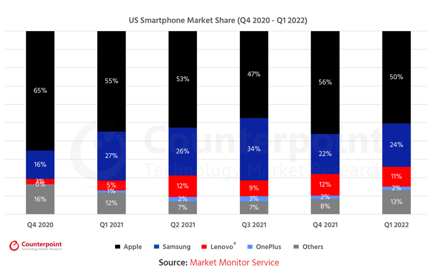 下圖是2022年第一季度美國市場智能手機份額,蘋果50%,三星24%,聯想12%,一加2%,其他手機品牌13%。