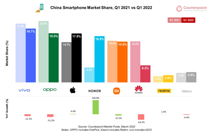 其一是芯片關,如果芯片供應問題不能解決,那麼華為手機的存量份額會不斷的下降,2022年第一季度華為手機份額還有6.2%,已經大大低於2020年全年31%的水平,而操作系統的生態是需要有數量作為支撐的,沒有足夠的裝機數量,沒有足夠的份額,則難以支撐生存和競爭。