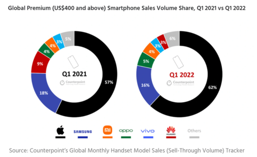但在高端市場仍有極大的潛力可以挖掘,我們印像中一直認為5000元人民幣以上才算高端市場,其實不然,根據Counterpoint的數據,全球400美元以上的高端市場中,蘋果的份額竟然高達62%,三星也佔了16%,而OPPO,小米,vivo,華為四家加起來僅有15%。