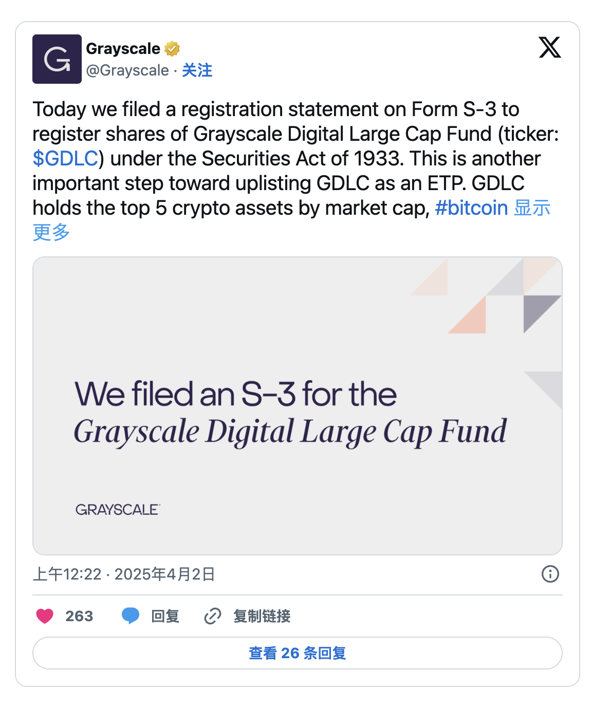 週二,Grayscale 向美國證券交易委員會 (SEC) 提交申請,計劃將其數位大盤基金 (Digital Large Cap Fund) 轉變為所有散戶投資者都能參與的公開投資工具。