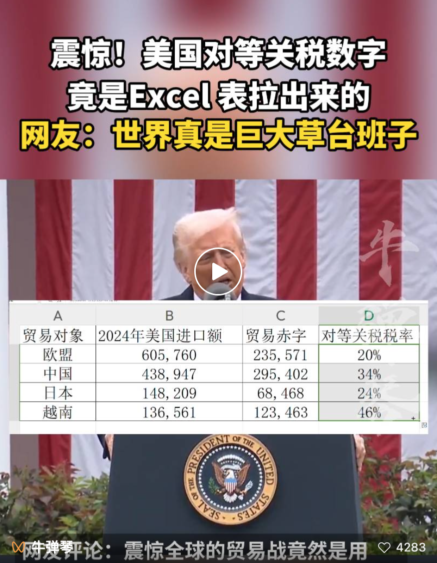 經濟是最講究資料的,看川普公佈的關稅稅率,比如,指責中國對美徵稅是67%,他報復一半,再加徵34%。67%怎麼算出來的?