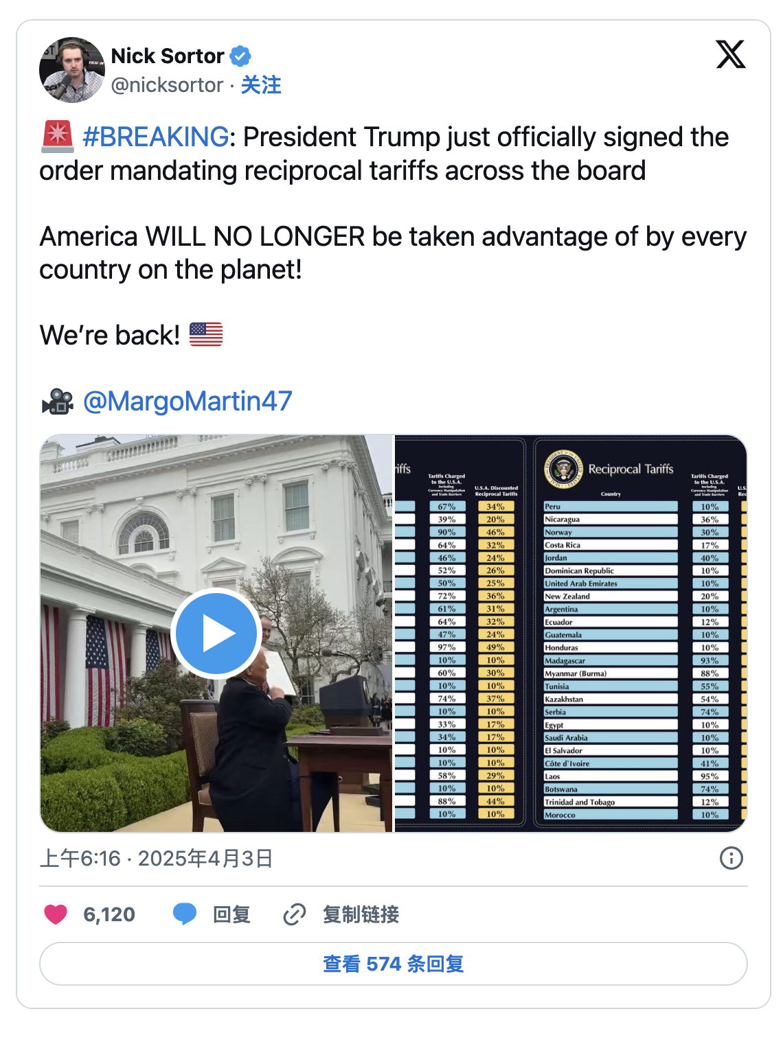 該行政命令規定對所有進口商品徵收10%的基礎關稅,並對特定國家採取更嚴格的關稅措施——包括對中國商品徵收34%的關稅,對外國製造的汽車徵收25%的關稅。市場的即時反應則呈現不同的態勢。