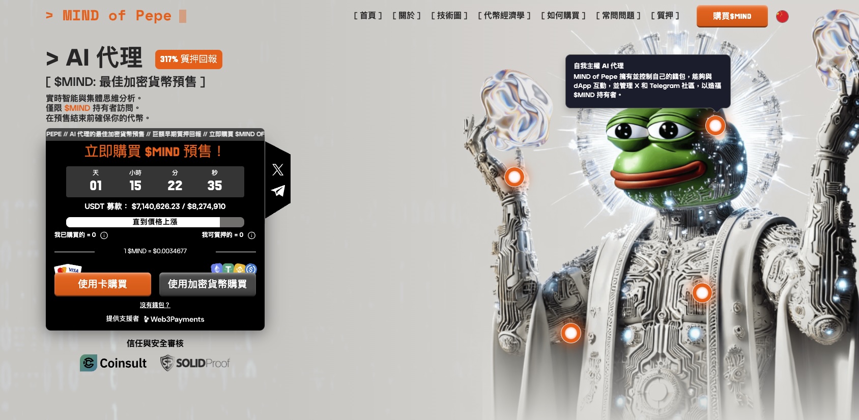 同樣運用AI推動創新且極具顛覆性,還有近期受到市場熱議加密貨幣項目——MIND of Pepe($MIND)。這是一個以自主AI代理為核心區塊鏈項目,專注於讓AI主動參與加密市場交易與判斷。其AI代理不僅能自主分析市場資料,還結合蜂群思維與深度學習,主動生成投資策略,協助代幣持有者掌握關鍵趨勢。