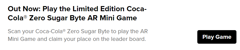 當然如果僅僅認為可口可樂只是在產品包裝上大做文章,就有些太過膚淺地理解品牌在元宇宙營銷方面的挖掘。「零糖字節」是最耀眼的一環,但並不是全部。圍繞著「零糖字節」,可口可樂公司還展開了多方位的數字營銷。掃描「零糖字節」的二維碼,還可以參與AR形式的mini game,點擊play game,你將進入全新宇宙。