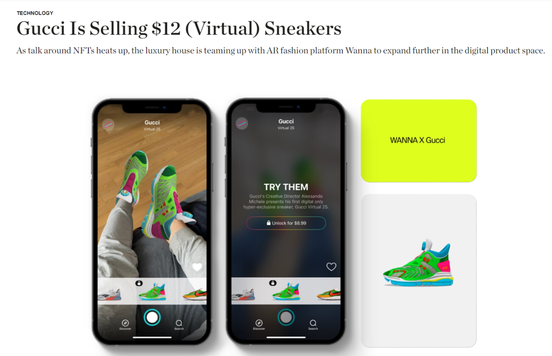 除此之外,Gucci還十分看重「分享」在元宇宙品牌營銷中的潛能。在虛擬貨幣市場一度火爆又一度退潮的動盪裡,社交貨幣依然在元宇宙市場裡表現出色。Gucci在App中推出了球鞋主題的數字內容板塊Gucci Sneaker Garage,整合了產品故事、互動遊戲、藝術創意、虛擬試鞋等多樣內容,並發布了一款數字虛擬運動鞋Gucci Virtual 25。
