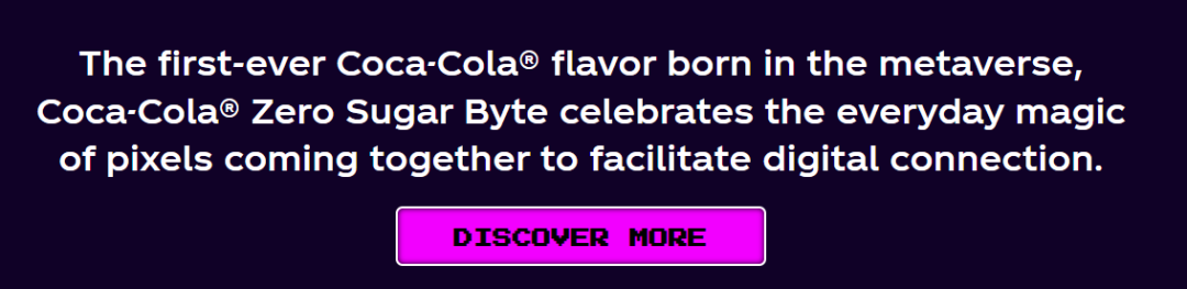 據公司官網介紹,「零糖字節」是元宇宙中誕生的首個可口可樂口味。「像素」不僅是概念核心,也是特有的包裝風格。如同像素聚集在一起的魔力促進數字連接,可口可樂公司將飽滿的創意凝於一款產品,將抽象的像素嵌入一種感官,挑逗消費者的想像力。