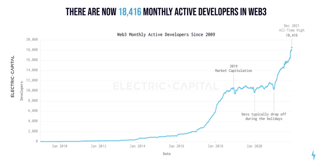 據Electric Capital發布報告顯示,相比2020年12月,2021年全球研究開源加密貨幣和Web3項目的月活開發人員超過1.8萬人,增長了195%,數量達到史無前例的水平。並且,加入以太坊生態的Web3開發者中65%都是2021年進入的。