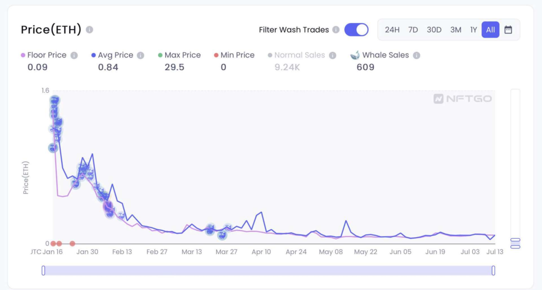 例如今年1月,國民級表情包“冷兔寶寶”發行NFT,上線當日僅半天價格就翻了23倍。雖然據該項目官網的路線圖為項目制定了長遠的計劃,通過與鏈遊合作、品牌聯名等方式維持NFT的長期價值,但用戶似乎並不買賬,目前該項目的NFT平均價格已從1.39以太幣跌至0.09以太幣,地板價也為0.09以太幣。