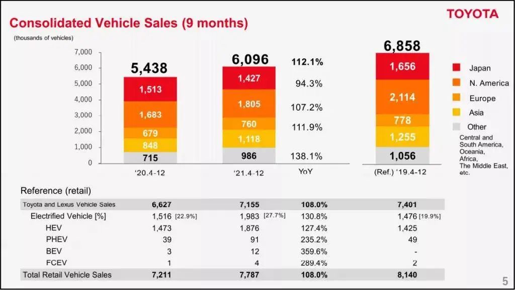 2022財年前三季度(也就是2021年4月至12月)的豐田財報中,豐田純電車型(BEV)銷售量在全球僅為1.2萬輛,相比豐田車在全球609.6萬的銷量,幾乎可以忽略不計。