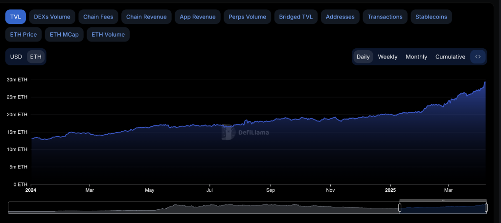 根據 DeFi Llama 的數據,以太坊的去中心化金融(DeFi)生態系統仍然是加密領域中 TVL 和穩定幣儲備量最大的網路。