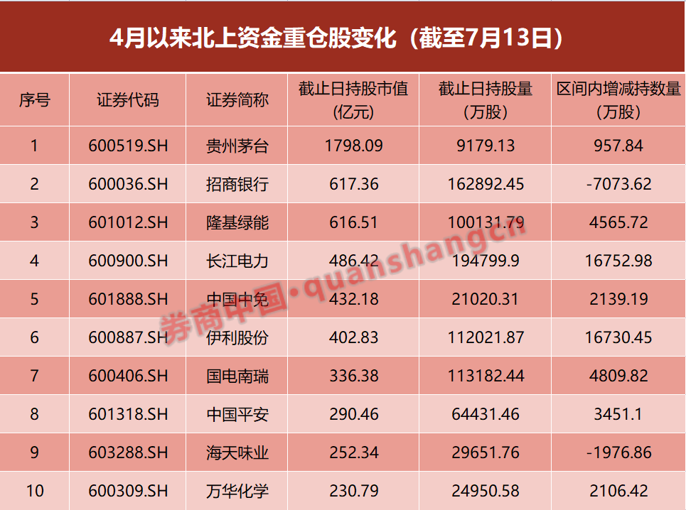 具體到持股,期間北上資金對重倉股進行了全面增持。前十大重倉股中,貴州茅台、隆基綠能、長江電力、中國中免、伊利股份、國電南瑞、中國平安、萬華化學均得到增持。僅招商銀行、海天味業被減持。