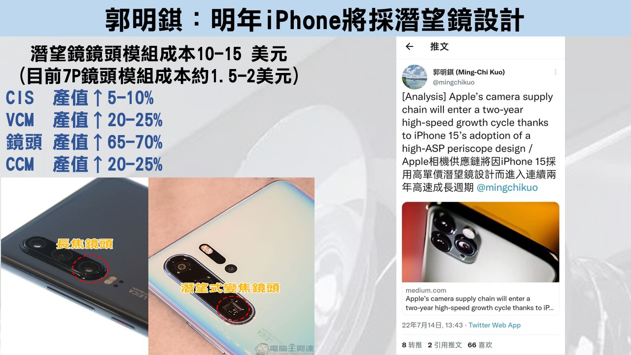 郭明錤發布:「蘋果iPhone 15將採用潛望鏡設計,因此相機模組單價更高,台廠大立光與第二供應商玉晶光可望受惠,並進入連兩年的高速成長期。」