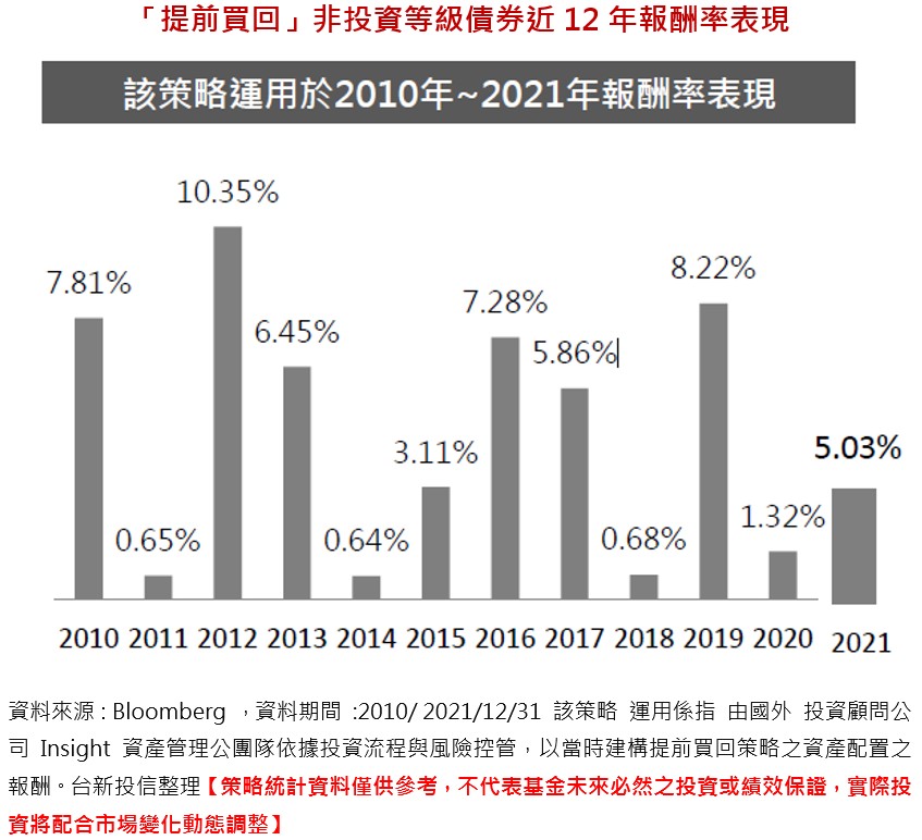 台新投信表示,全球通膨壓力難解,各國央行加速緊縮腳步,使得金融市場大幅震盪,而高通膨使股票、公債、投資等級債實質收益率轉負,僅高收益債、美元新興市場債為正,預期後市較佳息收之非投資等級債券將獲市場青睞,其中,「提前買回」非投資等級債券擁有「息優、短期、受總經影響有限」三大利多,深具「截長補短」優勢,滿足投資人「較低波動、較佳息收」二大訴求,據統計,運用「提前買回策略」之非投資等級債券近12年來正報酬機率高,為現階段市場動盪下絕佳資金避風港。